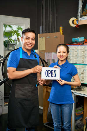Positive young people holding sign opening bicycle workshop and smiling at camera