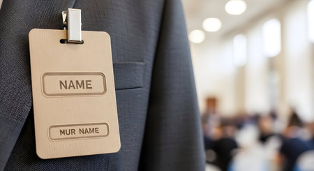 Blank name tag on a lanyard, representing corporate identity and networking.