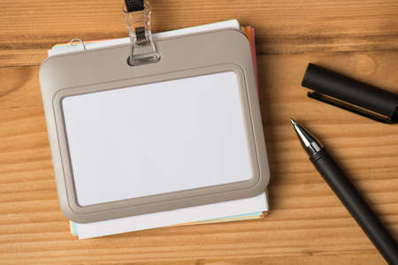 Blank plastic badge. Template for ID. White badge on wood table background. Mock-up for branding identity for designers. Top view.