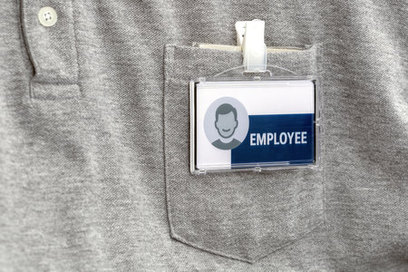 A gray shirt with employee badge clipped to pocket, featuring generic icon and word employee prominently displayed. badge is clear and professional