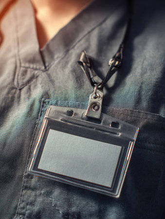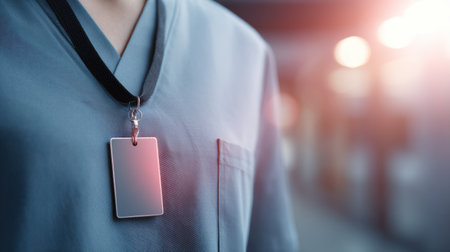 A medical professional in scrubs wears a blank ID badge, illuminated in a clinical setting, emphasizing the importance of identification in healthcare.