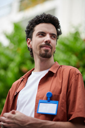 Businessman at an exhibition or conference showing a blank security identity name card on a lanyard