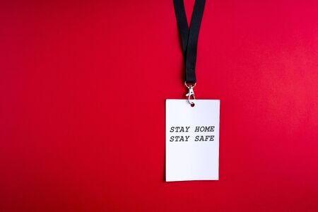 Blank white paper bagde on red background, lanyard with stay home, stay safe sign, Pandemic concept, warning sign