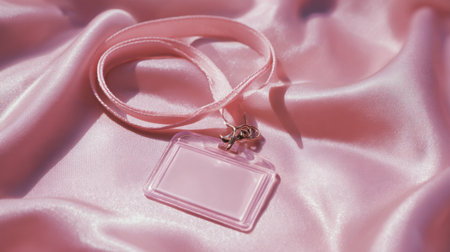 A sophisticated pink satin fabric serves as a backdrop for a blank ID badge suspended from a pretty ribbon, perfect for stylish events and branding.