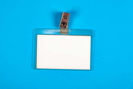 Blank badge with drawstring on a light blue background. Mock badge, name tag. Top view, flay lay