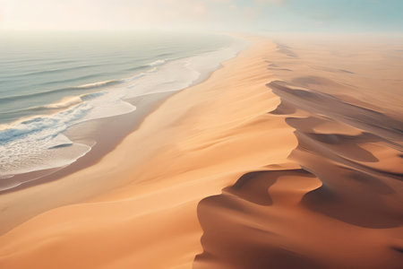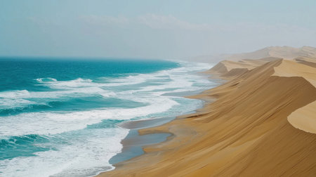 The shifting dunes form a natural masterpiece along the coastline, where rippling sands meet the rhythmic waves in a harmonious and ever-changing tableau.