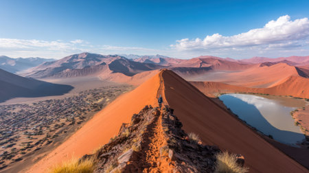 Panoramic view from the sickle shaped sand dune next to Sossusvlei towards the north-east. Sand dunes and a tourist are visible