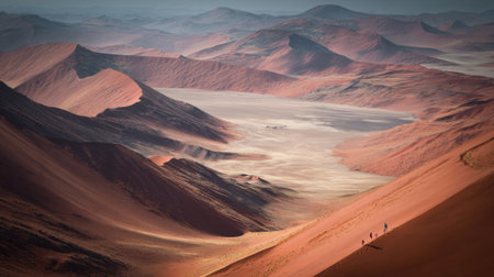Desert landscape. Sand dunes and group of people seen from their back walking on a dune. Namibia. Africa