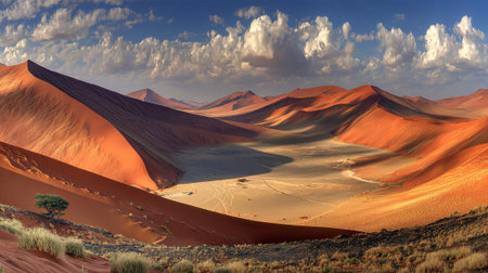 Stunning Panoramic View of Vast Arid Sand Dunes in Namibia s Desert Landscape Under Dramatic Sky