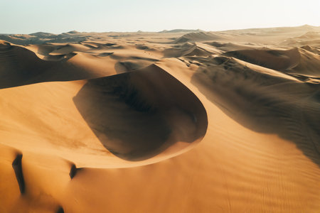 An expansive aerial view showcases the beauty of a desert landscape featuring rolling sand dunes bathed in warm golden light, highlighting nature's quiet majesty.
