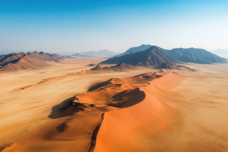 Aerial photography of vast desert landscape with sand dunes and mountains