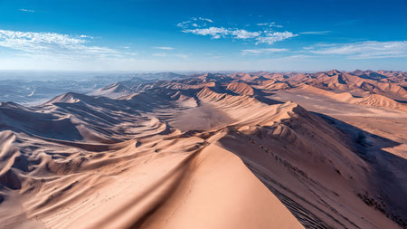 Drone perspective of sunlit sand dunes midday showing the stark contrast of light and shadow. AI generated.
