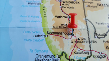 View of Keetmanshoop, is the administrative capital of the Karas Region in southern Namibia, on a geographical map of Africa, marked with red pushpin