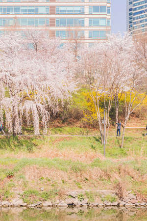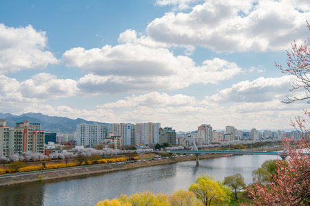 Daegu, Korea - April 1, 2022 : Panoramic view of Dongchon riverside park and city at spring