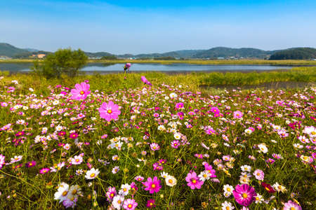 Beautiful landscape of blooming cosmos flowers in a rural field on a sunny day