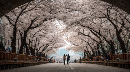 A picturesque scene of sparkling cherry blossoms in full bloom with couples embracing in a lively urban park, capturing the essence of springtime joy and beauty.