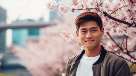 Modern happy young smiling Asian guy against the background of blooming pink cherry trees and metropolis city. Businessman, spring blossoms, happiness joy dreaming love, Mental health, psychological treatment concept, positive thinking, good thoughts