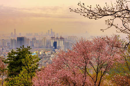 Cherry blossom in the early morning of spring in Namsan mountain with the buildings of Seoul city is in the background