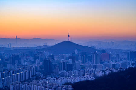 Sunrise of Seoul Downtown cityscape . Aerial view of Nansan Seoul Tower and lotte tower. Viewpoint from Ansan Bongsudaemountain best landmark of Seoul , South Kore