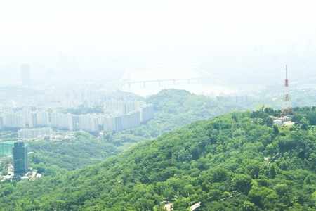 Panoramic view of Seoul city and mountains from Namsan tower in Seoul, Korea