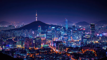 Seoul city skyline lit up at night, with towering skyscrapers and a clear view of Namsan Mountain and Bukhansan, creating a perfect balance of urban and natural beauty.