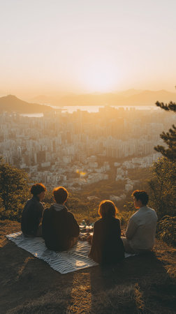 Four friends enjoying peaceful moment on blanket at sunset, overlooking sprawling city landscape from mountaintop, feeling relaxed and happy together
