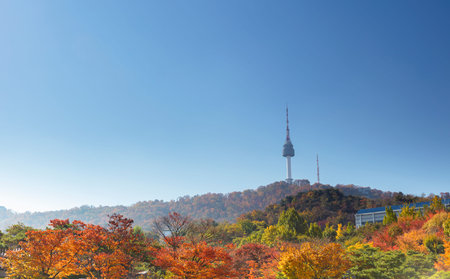 Seoul, South Korea on 11 Nov 2024. A tall tower rises against a vibrant blue sky, framed by bright red autumn leaves, creating a scenic view with warm lighting ideal for travel or nature content.