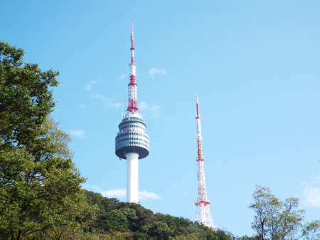 N Seoul Tower, or Namsan Tower, and the blue skies above Seoul in autumn.