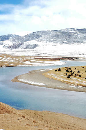 Landscape of blue lake and snow covered mountains in the highlands of Tibet