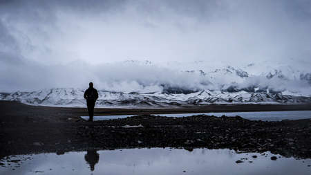 Two travelers walks near Tso Kar Lake in Himalaya Mountain