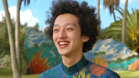 Joyful Young Person Smiling in Vibrant Outdoor Landscape with Nature Background.