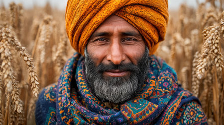 Portrait of Elderly Man in Orange Turban in Wheat Field