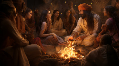 A group of Indian Muslim men sit together in a village, engaged in conversation and sharing stories, reflecting community bonds and traditions at dusk.