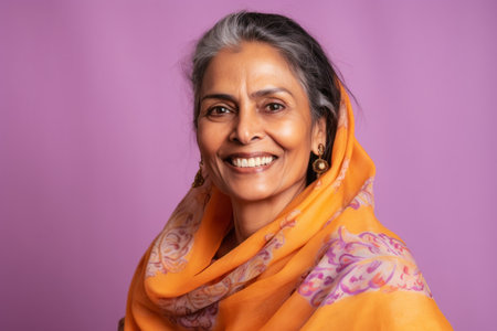 Portrait of smiling Indian woman wearing yellow scarf on purple background.