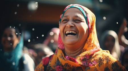 A joyful woman 45 years old from Afghanistan displays a bright smile while wearing traditional clothing. She stands confidently, embodying a sense of peace in her rural community. Generative AI.