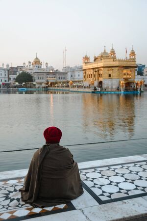 alone indian sikh man sits near the water of Golden Temple. 24 february 2018 Amritsar, India.