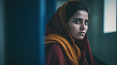 A woman in a red headscarf looks directly at the camera with a stoic expression