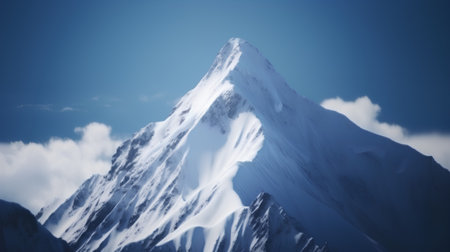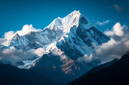 A picturesque snowy mountain is beautifully covered in fluffy clouds, set against the vivid backdrop of a clear blue sky