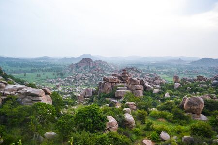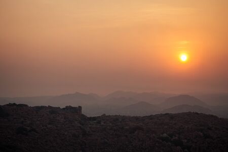 A distant landscape of the Anjana Matha temple on a mountain in Hampi, Karnataka, India