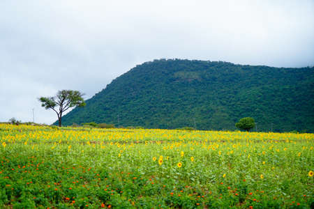 Beautiful valley with sunflower cultivation at the foot of a hill, landscape, long shot