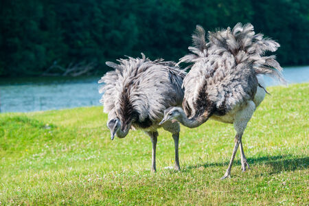 Pair of African ostriches (Struthio camelus) with beautiful feathers walking