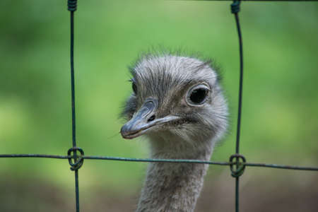 Ostrich in a zoo behind a metal grating.ostrich in the cage on a sumer sunny warm day.