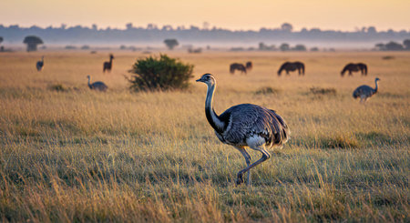A majestic ostrich gracefully walks through golden grasslands, showcasing its unique feathers in a peaceful natural habitat, basking under bright sunlight.