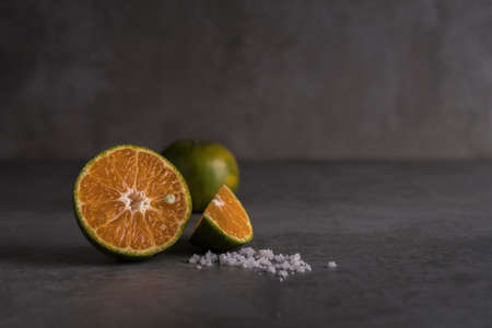 Citrus fruits on a gray background. Selective focus.