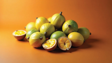 Radiant woman holding a goldenberry fruit, with a vibrant yellow and green color scheme and a sunny background