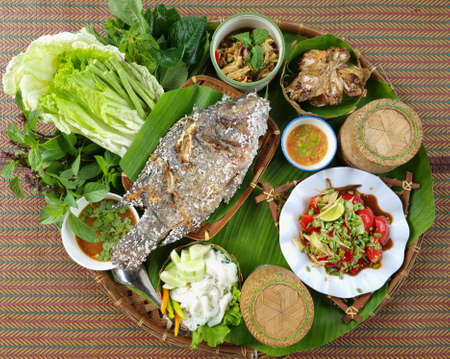 Isan food is delicious, Thailand food, Top view, Warm color tone