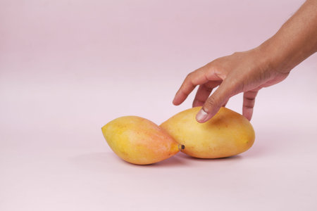 Top view of yellow mango on pink background. Tropical fruit juicy and sweet.