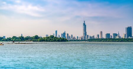 Nanjing city skyline and Jiming temple in Nanjing, Southern China.