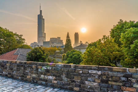NANJING, CHINA - NOVEMBER 09: This is the Nanjing ancient city wall with a view of the ZIfeng tower during sunset on November 09, 2019 in Nanjing