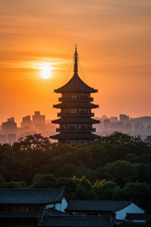 The tranquility of the ancient pagoda in the sunset, the Zen beauty of the ancient pagoda in the twilight